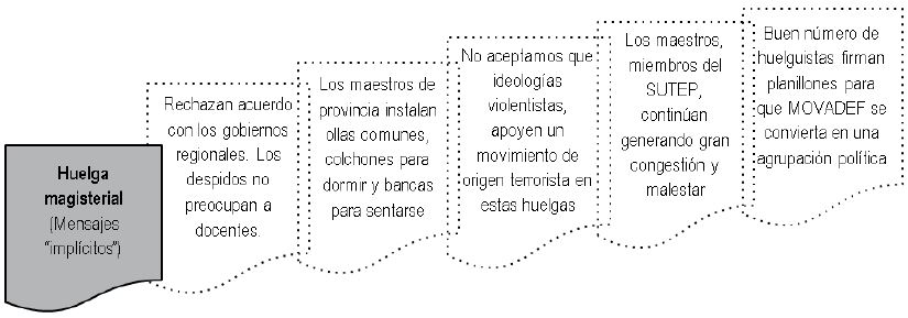 El sentido impreso por los medios resalta esencialmente el carácter sensacionalista de la huelga magisterial, de ligar la movilización docente con movimientos terroristas, de generar caos urbano, entre otros aspectos de sentido alarmista o catastrofista. Estas representaciones superficiales del desenlace de la huelga inducen a la audiencia a "pensar" como violentistas o promotores de anarquía. El léxico utilizado traduce sensaciones de suspenso, de alarma social, de modo, que se forman "imágenes" que deforman los hechos, al poner atención en expresiones que los califican como intransigentes, terroristas, etc.
