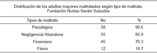 Los tipos de maltrato más frecuentes en las adultas y adultos mayores, evidenciados fueron el maltrato psicológico (90.6%), el maltrato por negligencia (85.9%), le sigue el maltrato financiero (70.3%) y se detectó maltrato físico en 12 adultos mayores que representó el (18.7%).