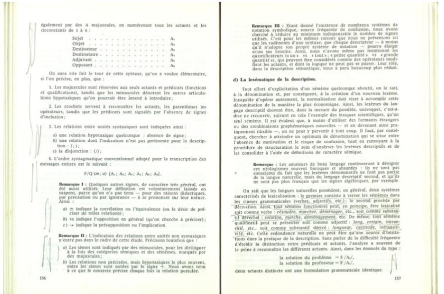 Knygos skyriuje „Mokslinės semantikos sąlygos“ paryškinti atraminiai metodologiniai teiginiai: „Žmogaus pasaulis mums iš esmės atrodo apibūdinamas kaip reikšmės pasaulis. Pasaulis gali būti vadinamas „žmogišku“ tik tiek, kiek jis ką nors reiškia.“ Pabrėžtas Greimo teiginys, kad kalbotyra, atliekanti humanitariniuose moksluose katalizatoriaus vaidmenį, „pasirodė esanti ne tik abejinga, bet netgi priešiška bet kokiems semantikos tyrimams“. Išvada, kad struktūrinėje kalbotyroje „semantika yra akivaizdžiai ir sąmoningai užmiršta“, pažymėta klaustuku. Skyriuje „Semiologinis lygmuo“ pabrauktas ir paraštėje vertikaliu brūkšniu palydėtas teiginys „poezija yra kalba, arba, tikriau sakant, ji įsikuria kalboje. Bet koks nelingvistinis poezijos aprašymas būtų visiškai nenaudingas, o gal ir neįmanomas vertimas“. Skyriuje „Diskurso izotopija“ paraštėje pabraukta Baudelaire’o eilėraščio „Splinas“ („Je suis un vieux boudoir“) citata ir nuoroda į Alfredo de Vigny eilėraštį „Mozė“, atkreiptas dėmesys į išreikštos ir paslėptos pranešimo plotmės perskyrą Freudo psichoanalizėje. Miltinį domino semiotinės teksto aprašymo procedūros. Skyriuje „Samprotavimai apie aktantinius modelius“ paryškinti aktantinių vaidmenų pagal Proppą ir pagal Souriau sąrašai, pabrauktas Barthes’o teiginys, kad Racine’o tragedija nėra psichologinė.