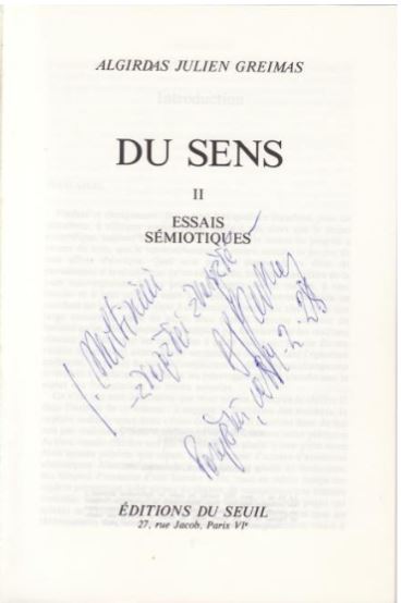 Dans le deuxième recueil d’essais sémiotiques de Greimas Du sens II, on trouve une dédicace impressionnante : « À J. Miltinis – une étoile à une étoile – A. J. Greimas ».