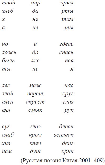 В этом стихотворении отсутствуют китайская лексика, образность. Подражание создается за счет строфики, графического рисунка: разделение на четверостишия рождает эффект китайского иероглифа; разметка между словами задает тексту вертикальный вектор прочтения – по аналогии с китайским свитком. Употребление односложных слов уподоблено ритмике китайского языка, что при горизонтальном прочтении воспринимается как трехсложная, а в вертикальном – как четырехсложная конструкция4. Вместе с тем, форма стихотворения контрастирует с его содержанием, главной темой которого является утверждение «ты не я / я не ты». Односложность русской лексики дает автору возможность ярче передать внутренний драматизм текста, скрытый за поэтической игрой.