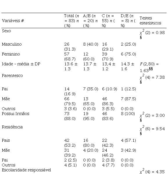 # Nos casos em que não há a amostra total, o participante não informou sobre a variável em questão ou ela não se aplicava àquela situação.§ Teste qui-quadrado de Pearson.§§ Análise de Variância (ANOVA) one-way.Em relação aos dados dos estudos por desempenho escolar referentes à prática de estudo (Tabela 2), houve diferença estatisticamente significativa somente no que tange à percepção dos responsáveis em relação a problemas de saúde do aluno, sendo identificada a concentração/atenção (p < .05) menos frequente nos alunos de alto desempenho (A/B) quando comparados aos de médio desempenho (C).
