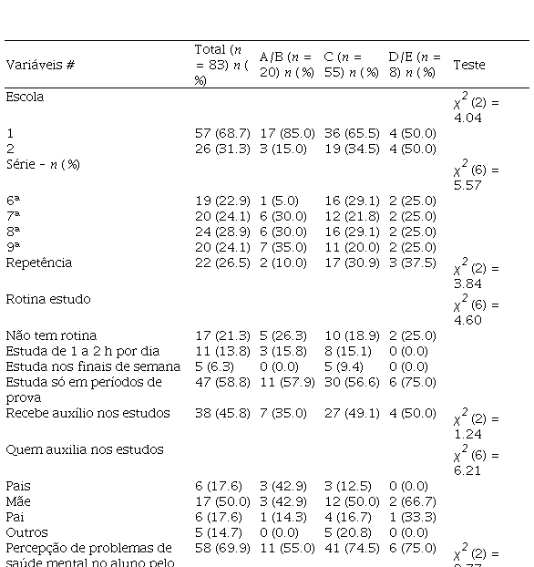 São apresentados, inicialmente, os dados referentes a cada um dos instrumentos e, posteriormente, os resultados da análise inferencial acerca das correlações existentes entre as variáveis (saúde mental, dados sociodemográficos e desempenho escolar).
