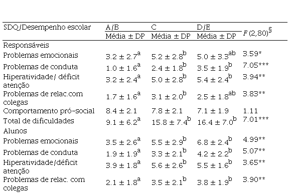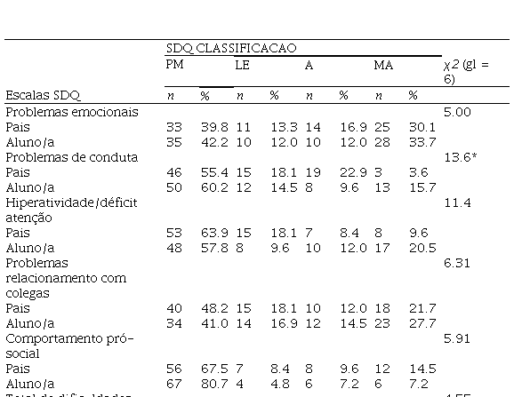 # Nos casos em que não há a amostra total, o participante não informou sobre a variável em questão ou ela não se aplicava àquela situação.* p < .05As Tabelas 3, 4 e 5 são referentes ao instrumento SDQ. A fidedignidade e confiabilidade do instrumento foram avaliadas pelo coeficiente de Alfa de Cronbach para pais e alunos. Os valores indicaram boa consistência interna para ambos os grupos (α = .73 e α = .76, respectivamente).