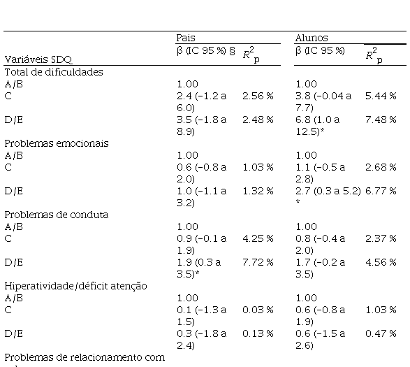 § Análise de Variância (ANOVA) com transformação logarítmica para as variáveis assimétricas.a,b Letras iguais não diferem pelo teste de Bonferroni a 5 % de significância.* p < .05** p < .01*** p < .001Já na Tabela 5 estão apresentados os dados referentes à análise de regressão linear múltipla, como o coeficiente angular (β), juntamente com o intervalo de 95 % de confiança e coeficiente de determinação (R2) parcial, para análise do efeito do nível de desempenho nos escores do SDQ dos pais e alunos. Após controle por variáveis intervenientes nas escalas avaliadas pelos pais (problemas de conduta) e pelos alunos (total de dificuldades e problemas emocionais), os alunos com baixo desempenho (D/E) apresentaram pontuação mais elevada quando comparados a dos alunos com alto desempenho (A/B). Segundo a avaliação dos alunos, aqueles com médio desempenho (C) apresentaram maior pontuação na escala de “problemas de relacionamento com colegas” quando comparados aos alunos de alto desempenho (A/B), conforme a análise de regressão linear múltipla.