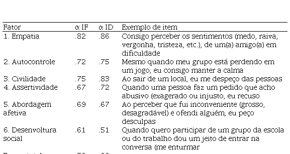 Composto por 38 itens, trata-se de um instrumento para adolescentes (faixa etária entre 12 e 17 anos) baseado nos autorrelatos sobre situações cotidianas. O indicador de frequência pontua o quanto o adolescente se comporta de determinada maneira e uma situação. O indicador de dificuldade pontua o quanto é difícil se comportar da maneira descrita no item, refere-se ao custo subjetivo relatado pelo respondente. O IHSA produz um escore geral e nos seis fatores. Na Tabela 1 são apresentados os índices de consistência interna nos indicadores de frequência e dificuldade, segundo os autores, e apresentado um exemplo de item por fator.