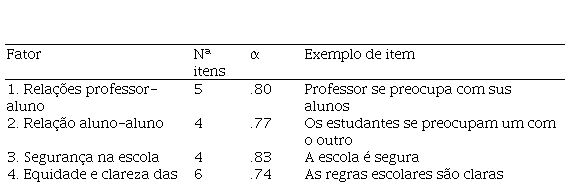 Composta por 28 itens, desenvolvidos para fornecer as escolas uma avaliação do clima escolar, na perspectiva do estudante, em especial nas dimensões apoio social e da estrutura, em seis áreas: relação professor-aluno, relação estudante-estudante, equidade e clareza de regras, segurança escolar, bullying em toda a escola e engajamento estudantil em toda a escola. Na Tabela 2 apresenta-se os seis fatores que compõe o instrumento, os índices de confiabilidade obtidos pelos autores da escala e exemplos de itens: