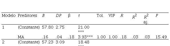 No que diz respeito à comparação dos estudantes do 1º ano quanto aos construtos Habilidades sociais, Motivação para aprender e Clima escolar em relação aos estudantes do 9º ano do Ensino Fundamental, a análise do teste t de Student não mostrou diferença significativa em todos os construtos. A análise de regressão linear múltipla para prever se as variáveis Habilidades sociais e Motivação para aprender são preditoras da Percepção do clima escolar (Tabela 4) resultou em um modelo estatisticamente significativo [F(1,450) = 15.49; p < .001; R² = 0.03], considerando-se os escores totais. Somente a variável motivação para aprender foi preditora do clima Escolar (β = .18; t = 3.93; p < .001). A variável habilidades sociais (β = .19; t = 0.40; p > .05) não foi preditora da percepção do clima escolar.