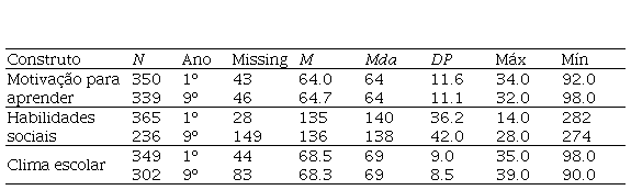 A Tabela 3 descreve as médias, medianas e desvios padrão das variáveis Motivação para Aprender, Habilidades Sociais e Percepção do Clima Escolar nos grupos de estudantes do 1º ano do Ensino Médio e do 9º ano do Ensino Fundamental e o número de participantes válidos por série e variável.