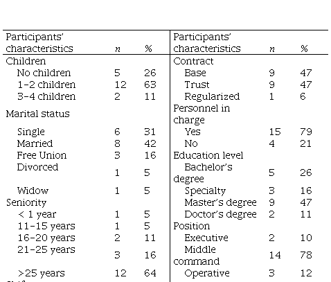 A total of 19 nurses completed the five sessions of the pilot workshop and answered all the questionnaires at two different times. The age means was 46 years old (SD = 7.42), 75 % had children, and over 55 % had an educational level superior to a master’s degree. 90 % of the participants had more than 16 years of experience and had morning shift, and 80 % had personnel under their command (Table 1).