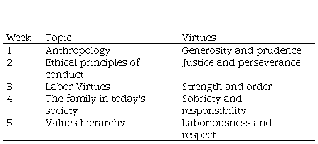 The main objective of the Ethics and Humanities Workshop was to facilitate a positive change in attitude towards work, in addition to promoting the recognition of work as a means to develop human virtues, to find the meaning of human work and of one's own existence. With the intention of meeting the objectives of the workshop, two virtues were addressed in each workshop session, as shown in Table 2.