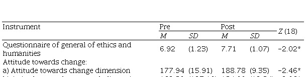 Descriptive statistical analyzes were used for sociodemographic data. To find out if there were significant differences between the attitude towards change before and after the ethics workshop, the Wilcoxon T test was performed. To know the association between the increase in knowledge of ethics and humanities, and the increase in the attitude towards change, a partial correlation analysis was carried out controlling for influence of age, number of children, monthly income, seniority, and level of studies.