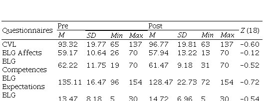 No statistically significant differences were found between the scores before and after the workshop in the general health status of the participants (CGS), in the subscales of the Labor Well-being Questionnaire (BLG), nor in the Questionnaire to measure the Quality of Work Life (CVL) of the Human Capital of the Ministry of Health (Table 4).