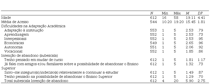 Participaram no estudo 611 estudantes do primeiro ano do ES de uma universidade pública do norte de Portugal. As idades dos estudantes variavam entre 16 e 58 anos, sendo a média de 19.11 (DP = 4.41). A maioria dos estudantes era do sexo feminino (67%) e apenas um número reduzido de estudantes referia ter uma atividade profissional em regime de tempo integral ou tempo parcial (8.3%). A maioria dos estudantes referiu, ainda, frequentar um curso de primeira opção (66%), e frequentam a universidade de primeira opção (78%). Os estudantes apresentavam notas de candidatura ao ES entre 10.2 e 19.2 (numa escala de 10 a 20), situando-se a média em 15.45 (DP = 1.81). No que se refere às habilitações académicas dos pais, 15% dos estudantes referem que o pai frequentou o ES e 21% refere que a mãe frequentou o ES. Por último, um pouco mais de um terço dos estudantes refere ter mudado de residência para frequentar a universidade (37%).