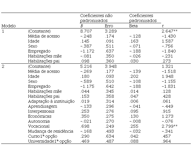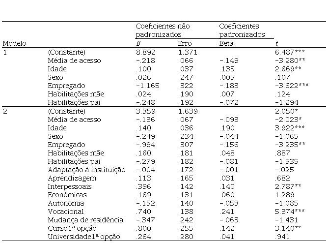 Na Tabela 2 apresentamos os resultados da análise de regressão linear hierárquica. Em primeiro lugar, analisa-se o impacto das variáveis média de acesso, idade, sexo, situação de emprego, habilitações académicas da mãe e do pai e, num segundo momento, acrescentam-se as variáveis dificuldades na adaptação (adaptação à instituição, aprendizagem, interpessoais, económicas, autonomia, vocacional), mudança de residência, curso de primeira opção de escolha e universidade de primeira opção de escolha. Nesta análise avalia-se o impacto destes dois conjuntos de variáveis na intenção de abandono dos estudantes.