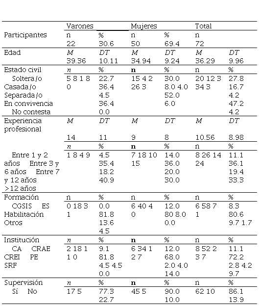 En el estudio participaron 72 profesionales de la educación social (30.6% varones, 69.4% mujeres) del ámbito residencial de protección a la infancia y la adolescencia de Cataluña: centro de acogida (CA), centro residencial de acción educativa (CRAE), centro residencial de educación intensiva (CREI), pisos de emancipación para mayores de edad (PE), y residencias para jóvenes sin referentes familiares (SRF).