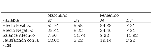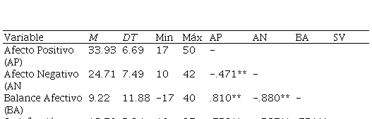 * p < .05** p < .01El estadístico rho de Spearman señala la existencia de una correlación negativa entre Afecto Positivo y Afecto Negativo (-.451), y una correlación positiva con Balance Afectivo (.790), Satisfacción con la Vida (.439) y Resiliencia (.482). El Afecto Negativo tiene una correlación negativa con el Balance Afectivo (-.888), la Satisfacción con la Vida (-.296) y la Resiliencia (-.353). El Balance Afectivo tiene una correlación positiva con la Satisfacción con la Vida (.412) y la Resiliencia (.485). Finalmente señalar la correlación positiva entre Satisfacción con la Vida y Resiliencia (.342).