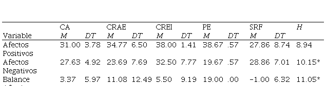 * p < .05Los resultados señalan diferencias estadísticamente significativas en relación con las dimensiones Afecto Negativo y Balance Afectivo. Un análisis más detallado de las diferencias, mediante U de Mann-Whitney para la dimensión Afecto Negativo, señala las diferencias significativas entre entro de acogida (CA) y pisos para mayores de 18 años (PE), o entre estos y los recursos para jóvenes sin referentes familiares (SFR), y entre centro residencial de educación intensiva (CREI) y pisos para mayores de 18 años (PE). Y para la dimensión Balance Afectivo, se encuentran diferencias significativas entre los recursos para jóvenes sin referentes familiares (SRF) centros residenciales de acción educativa (CRAE), entre recursos para jóvenes sin referentes familiares (SRF) y pisos para mayores de 18 años (PE), y centro de acogida (CA) y pisos para mayores de 18 años (PE).