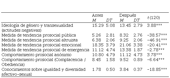 En la Tabla 1 se presentan los análisis de los efectos del programa de innovación, comparando la puntuación en las variables empatía, actitudes y conocimientos sobre diversidad afectivo-sexual, corporal y de género en esta muestra antes y después de su participación en el programa, hallándose diferencias en las puntuaciones en estas variables. Concretamente, se encontró un incremento en las puntuaciones en las variables de empatía, actitudes y conocimientos seleccionadas para su evaluación.