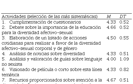 Para valorar el grado de satisfacción y la utilidad percibida asociado a las principales actividades del programa (Cumplimentación de cuestionarios y reflexión posterior sobre los resultados en los seminarios de clase; Debate sobre la importancia de la educación para la diversidad afectivo-sexual; Elaboración de un listado de acciones cotidianas para realizar a favor de la diversidad afectivo-sexual corporal y de género; Análisis de noticias sobre diversidad; Análisis y valoración de guías sobre lenguaje no sexista; Visionado de película o corto sobre esta línea temática; Recursos proporcionados sobre atención a la diversidad afectivo-sexual corporal y de género; Realización de actividad en grupo (mural, póster, etc) sobre atención a la diversidad; Conferencia o charla) se extrajo la media y la desviación típica.