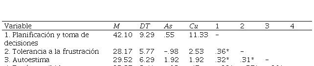 En la Tabla 1 se presentan los estadísticos descriptivos y los resultados del análisis correlacional realizado. Se encontraron relaciones estadísticamente significativas positivas entre tolerancia a la frustración y autoestima con planificación y toma de decisiones, siendo las relaciones de esta última variable estadísticamente significativas y negativas con el estrés percibido. Además, se observaron relaciones estadísticamente significativas positivas entre tolerancia a la frustración y autoestima; y relaciones estadísticamente significativas negativas de ambas variables y el estrés percibido.