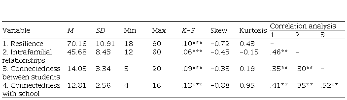 ** p < .01*** p < .001A comparison of means by sex was carried out using the Student's t-test for independent samples. The results showed that there were no differences in any of the variables. The matrix of bivariate correlations is included in Table 1. All the associations were positive and statistically significant at a level of < .01. The magnitude was low to moderate. The largest associations were found between the variable Resilience with Intrafamilial Relations and Connectedness with the school. As expected, the correlation of Connectedness between students and Connectedness with school was relatively high, because both are part of the same instrument.
