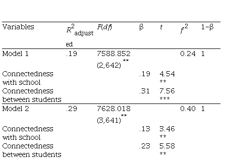 We carried out a hierarchical multiple linear regression analysis, which initially included the variables Connectedness with school and Connectedness between students, explaining 20% of the variance (Table 2). In the second model, the variable Intrafamilial Relations was included, reaching 29% of the variance. An increase in the size of the effect was obtained, positioning it as high, and the model showed high statistical power. The variable with higher predictive coefficient was intrafamiliar relationships, followed by connectedness between students.