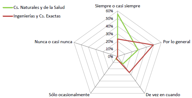 Estos resultados se podrían explicar debido a las exigencias que los cursos en CNS suponen para los estudiantes. Por ejemplo, Momsen et al. (2010) mencionan que los cursos introductorios de la licenciatura en Biología dan excesiva importancia a la memorización de hechos y detalles; además, explican que en esta área se sigue la metodología cuantitativa y los estudiantes deben integrar conocimientos a través de escalas de tiempo y espacio. Estas características de los cursos permiten comprender por qué al leer un texto de su área académica, los estudiantes de CNS suelen realizar una lectura rápida para fijarse en detalles como su organización y longitud; asimismo, revisan el texto para encontrar relaciones, esto probablemente, debido a su enfoque cuantitativo.