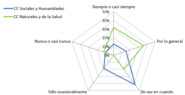 Ahora bien, del lado de los estudiantes de CSH, parece que podrían verse favorecidos por el uso más frecuente de las estrategias de “la realización de una lectura rápida” y “la revisión del texto de arriba abajo”. Por ejemplo, Gordillo y Flórez (2009) reportan que estudiantes de la licenciatura en Lengua Castellana, Inglés, y Francés, dependen de un nivel de lectura literal (por ejemplo, en búsqueda de una determinada palabra), hecho que podría verse relacionado con la realización de una lectura rápida.