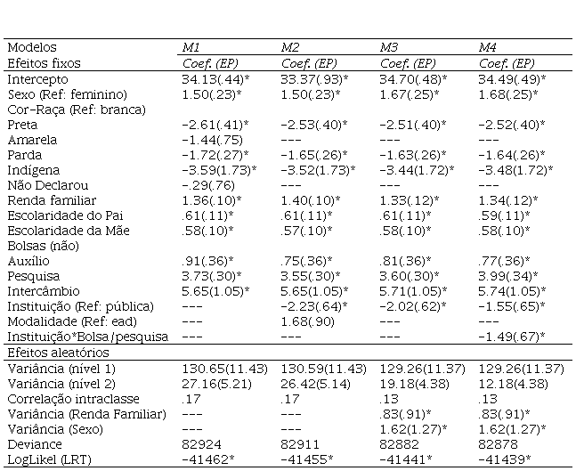 No modelo 1 (M1, model with all lower-level explanatory variables fixed) foram inseridas apenas variáveis do nível mais baixo (nível 1, aluno). Para este modelo, as variáveis dummy para Cor-Raça “Não Declarou” e “Amarela” não apresentam efeito significativo em relação a referência “Branca”. Na etapa seguinte (M2, higher-level explanatory variable) foram inseridas as variáveis referentes ao nível 2, tipo de “Instituição”, tendo a categoria “instituição pública” como referência e “Modalidade” com a categoria “educação a distância” como referência. Esta última não apresentou efeitos significativos na explicação da nota no exame. Após o ajuste desse modelo, testamos coeficientes de inclinação aleatórios (M3, random coefficient model) para as variáveis do nível 1 entre os cursos (nível 2). Para este modelo o melhor ajuste foi obtido com as variáveis “Renda familiar” e “Sexo” com inclinações aleatórias no nível 2. Na última etapa foram testados efeitos de interação entre variáveis de níveis diferentes (M4, cross-level interactions model). Apresentou efeito significativo a interação entre a dummy para a variável bolsa de “Pesquisa” (nível 1) e tipo de “Instituição” (Nível 2). Este modelo foi o que apresentou melhor ajuste em comparação aos modelos anteriores, tanto considerando o critério do LRT como pelo critério de Deviance.