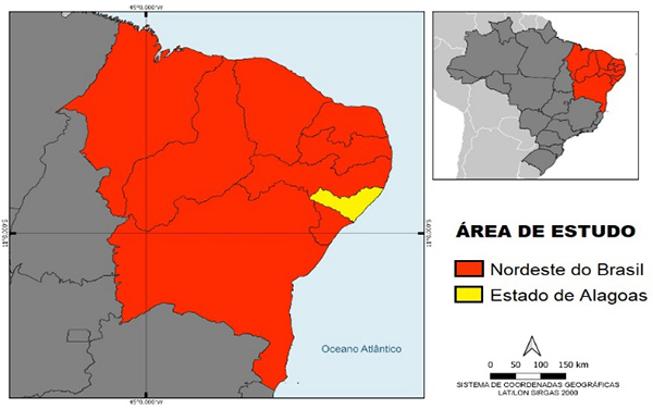 Os dados de trovoadas analisados foram para a região do estado de Alagoas situado no Nordeste Brasileiro (Figura 1). Esses dados foram obtidos através do código METAR disponibilizado pelo órgão DECEA (Departamento de Controle do Espaço Aéreo) do canal da Rede de Meteorologia (REDEMET) no endereço eletrônico: https://www.redemet.aer.mil.br. Realizou-se o download de dados para o Aeroporto Internacional de Maceió - Zumbi dos Palmares com coordenadas 9° 31' 02” S e 35° 47' 01” W, nos anos de 2018 e 2019. O código ICAO do aeroporto utilizado é SBMO.