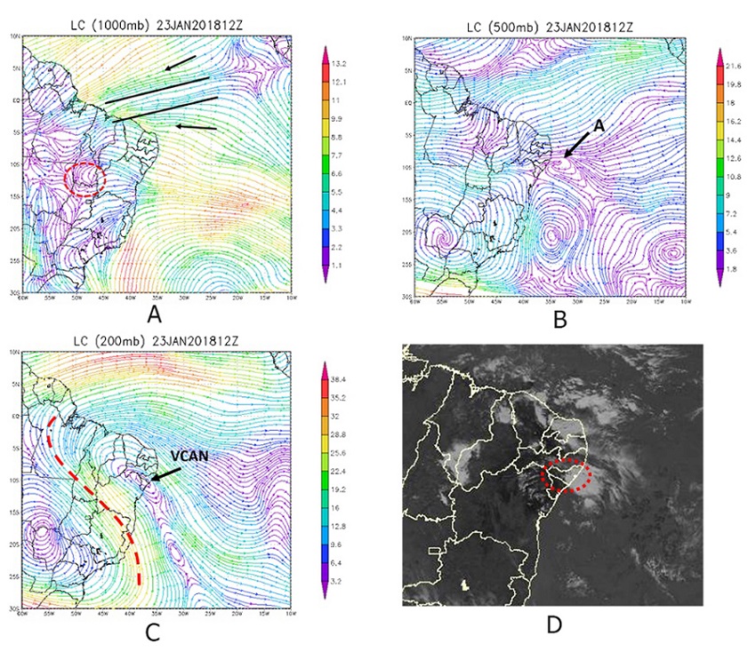 Para a análise do dia 23/01/2018 às 12 UTC (Figura 2A), no nível de 1000 hPa foi verificada a presença da ZCIT nas latitudes de 5°N e 5°S e dos ventos Alísios. A ZCIT é um sistema sinótico característico da região (Molion & Bernardo 2002). Foi identificado também uma confluência dos ventos sobre o continente (círculo vermelho) a sudoeste da trovoada. Em 500 hPa (Figura 2B), observa-se a influência de um anticiclone na costa leste de AL. Em 200 hPa (Figura 2C), constatou-se um núcleo de baixa pressão, ou seja, do VCAN sobre o continente. O VCAN está associado a Correntes de Jato do Nordeste Brasileiro (CJNEB). Este CJNEB do tipo Meridional (Costa, Levit & Fedorova 2013) liga as Correntes de Jato Subtropicais (CJST) dos dois hemisférios. A ocorrência de trovoadas em Alagoas aparece, como foi mostrado nos estudos anteriores (Brito et al. 2011; Cordeiro 2014; Santos 2012), relacionada aos VCANs de forma predominante, assim como coincide com a presença de Correntes de Jato e Cavados, sistemas responsáveis por promover a formação de nebulosidade.