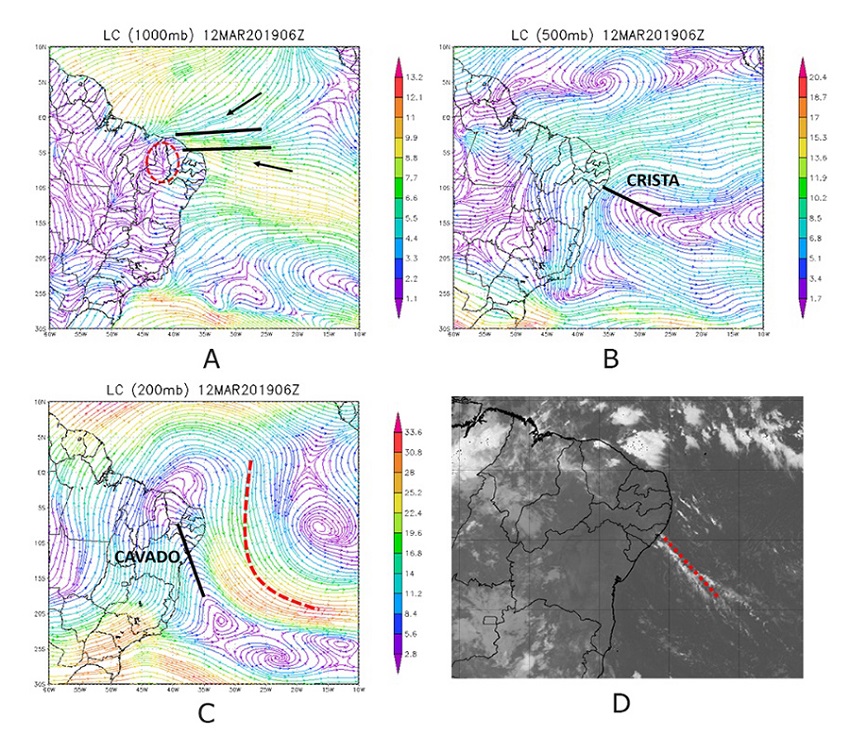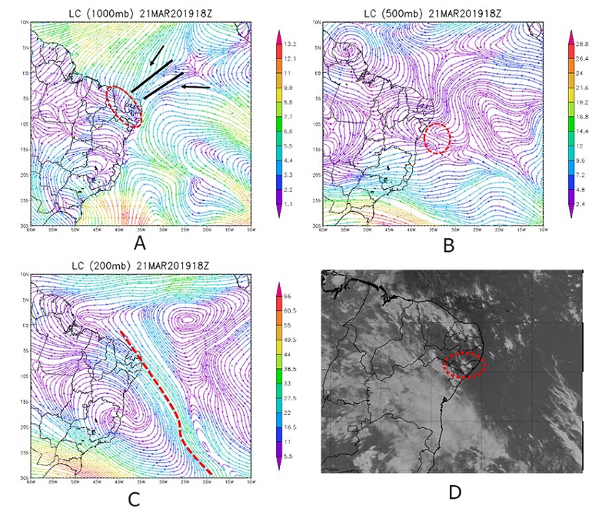 A análise do dia 12/03/2019 às 06 UTC (Figura 3A), em baixos níveis identificou a ZCIT em 5°S e os ventos alísios influenciando a região. A noroeste de Alagoas (círculo vermelho) é destacado uma confluência desses ventos. No nível de 500 hPa, existe somente uma crista a sudeste de AL. Em 200 hPa, a CJNEB meridional está saindo da região de circulação anticiclônica do Hemisfério Norte (HN) e foi associada a um cavado a oeste.