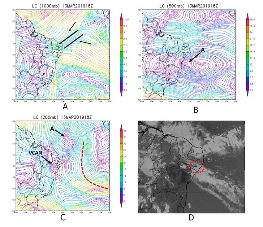 No caso 13/03/2019 às 18 UTC (Figura 4A), em baixos níveis há a ZCIT onde ocorre a confluência dos ventos alísios em direção ao Nordeste do Brasil (NEB). Em médios níveis, há um anticiclone com seu núcleo posicionado mais ao sul, fora de AL. Em altos níveis, sobre o Atlântico, aparece a CJNEB meridional causada pela corrente de ar do anticiclone no HN, ambos identificados na Figura 4C. A CJNEB aparece associada ao VCAN sobre o continente a oeste de Alagoas.