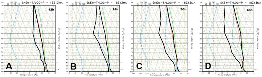 O Pp foi elaborado com base nas trajetórias das parcelas de ar utilizando o modelo atmosférico HYSPLIT (Hybrid Single Particle Lagrangian Integrated Trajectory); este modelo é disponibilizado pelo National Oceanic and Atmospheric Administration (NOAA) e está disponível no sítio eletrônico: http://www.ready.noaa.gov/HYSPLIT_traj.php. Dessa forma, as trajetórias das parcelas de ar foram calculadas com 12, 24, 36 e 48 horas de antecedência, na direção selecionada como BACKWARD, pois mostra de onde a parcela de ar veio até o ponto escolhido para ser feita a previsão, nesse caso, as coordenadas do aeroporto. Para construir o Pp foi preciso: 1) utilizar as coordenadas do ponto inicial da trajetória da parcela de ar, dadas pelo modelo HYSPLIT para cada um dos 10 níveis de pressão (1000, 950, 900, 850, 800, 700, 600, 500, 400 e 300 hPa), calculados para 12, 24, 36 e 48 horas de antecedência; 2) plotar o perfil simulado destas coordenadas, utilizando dados do ERA Interim; 3) obter os valores de T e temperatura do ponto de orvalho (Td), gerados pelos perfis de cada um dos 10 níveis de pressão; 4) construir o Pp atribuindo os valores de temperatura T e Td para cada linha de pressão mencionada anteriormente (método descrito em Fedorova et al. 2019). No Pp foi calculado os índices de instabilidade, descritos anteriormente (LI, K, TT e S), com exceção do CAPE, e permitiram verificar as condições de instabilidade da atmosfera em até 48 horas de antecedência.