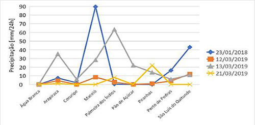A Figura 7 mostra as informações de precipitação diária (mm/24h). O dia 23/01/2018 teve o maior acumulado diário de precipitação, foi registrado 89.6 mm/24h em Maceió e São Luís do Quitunde com 43 mm/24h. O segundo dia de maior acumulado foi 13/03/2019, houve precipitações em todas as localidades analisadas, com máxima de 63.4mm/24h em Palmeira dos Índios. No dia 12/03/2019 não houve registros de precipitações em Água Branca, Pão de Açúcar e Coruripe, nos demais municípios houve pouco acumulado (menor que 8.4mm/24h). O último caso 21/03/2019 marcou máximo de 22 mm/24h em Piranhas e valores baixos ou nulos nos demais municípios.