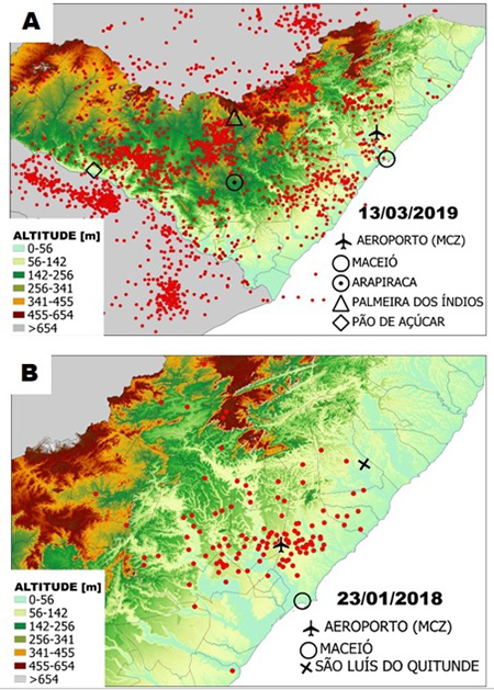 Também foram analisados os mapas com distribuição espacial das descargas atmosféricas durante todo o horário contabilizado com trovoadas. 13/03/2019 apresentou (17 até 23 UTC) a maior distribuição de raios em AL. Palmeira dos Índios, Arapiraca e Pão de Açúcar são os três municípios que formam a área com a maior densidade de descargas elétricas e estão todos identificados na Figura 8A. No último caso 23/01/2018 (09 até 13 UTC) as descargas atmosféricas se concentraram em áreas adjacentes ao aeroporto de AL nas regiões com aumento de elevação do relevo. Os municípios mais atingidos pelo fenômeno foram Rio Largo (próximo ao aeroporto) e Maceió (Figura 8B).