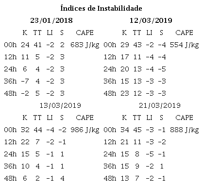 O índice S quando varia de -1°C <S< 3°C, indica chuva; se -2°C <S< -1°C, indica chuva e trovoada; se -5°C < S< -3°C, indica chuva e trovoada intensa (Fedorova et al. 2017). Na Tabela 1 os valores negativos variaram entre -5°C <S< -1°C, em quase todos os dias, com exceção de 23/01/2018 e 13/03/2019. Os valores positivos no dia 23/01/2018 formaram-se devido a uma previsão errada na formação de uma camada (800 até 850 hPa) de inversão subsidência, ou seja, absolutamente estável, esse resultado não foi mostrado em figura.