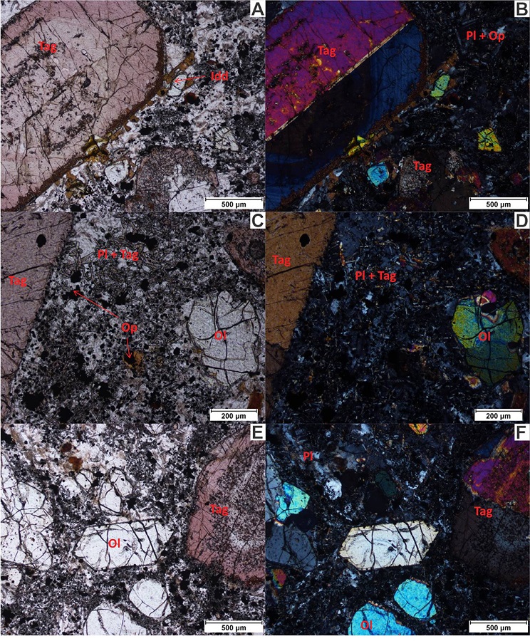 A iddingsita e a clorofeíta resultam da alteração da olivina e da titanaugita. A iddingsita ocorre na matriz, nas bordas e/ou dentro de cristais de titanaugita, é xenomórfica, de cor vermelho-sangue a vermelho claro, cujos grãos variam de 0,1 a 1 mm de comprimento ( Figura 2A).