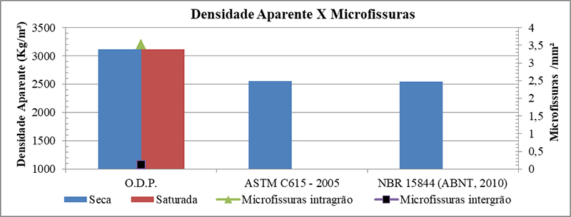 A análise conjunta dos resultados da densidade aparente, porosidade aparente e absorção de água indicam que o material estudado quantifica valores acima dos recomendados pelas normas C-615 ( ASTM 2005) e NBR 15844 (ABNT 2010a) ( Figuras 3 e 4). Verifica-se que a densidade aparente seca e saturada apresenta resultados superiores ao da norma ASTM, visto que o Olivina Diabásio Porfirítico possui elevada percentagem de minerais máficos (68%).