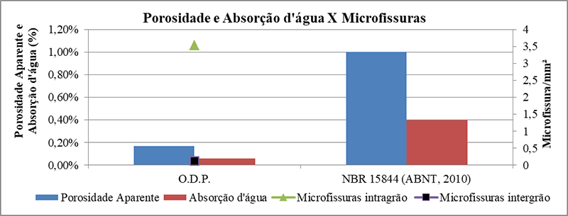A rocha em estudo possui porosidade aparente e absorção de água baixas, inclusive bastante inferiores as que são sugeridos pela norma da ABNT ( Figura 4). Este fato remete a presença de um bom engrenamento mineral do Olivina Diabásio Porfirítico que, apesar do elevado grau de microfissuramento (3,65/mm²), estas fissuras possuem dimensões pequenas, e em sua grande maioria são intragrãos, sem expressiva comunicabilidade entre si e os minerais, inferindo assim uma baixa absorção de água.