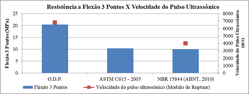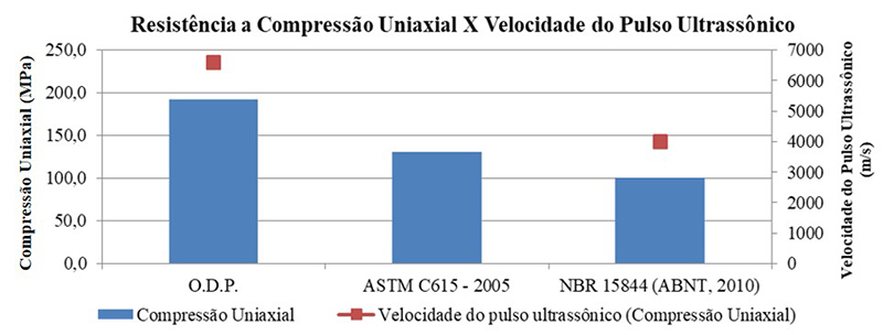A análise conjunta dos resultados da velocidade de propagação de ondas ultrassônicas para o Olivina Diabásio Porfirítico, tanto para os corpos-de-prova da compressão uniaxial quanto para os corpos-de-prova da flexão por três pontos, cumprem com os valores recomendados pela norma da ABNT ( Figura 8).