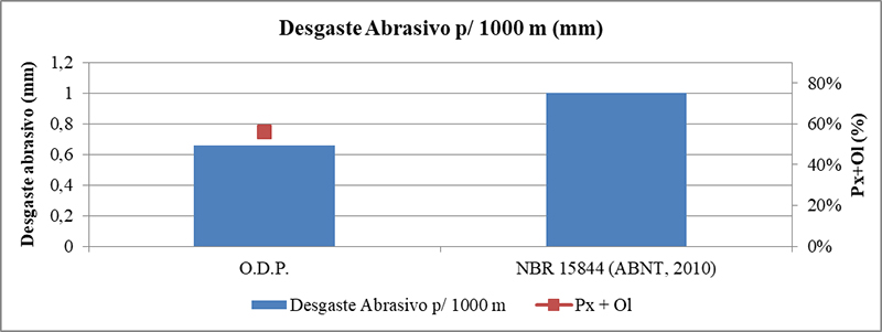 A análise da resistência ao desgaste Amsler indicou que o Olivina Diabásio Porfirítico desgastou 0,66 mm após o percurso de 1000 m, portanto dentro dos valores limítrofes sugeridos pela norma ABNT (desgaste máximo de 1 mm) ( Figura 7). Mesmo apresentando elevada porcentagem de minerais máficos e uma nula percentagem de quartzo, os resultados apresentados foram satisfatórios, sendo atribuídos a um bom engrenamento mineral, e muito provavelmente, por possuir uma matriz fina e homogênea.