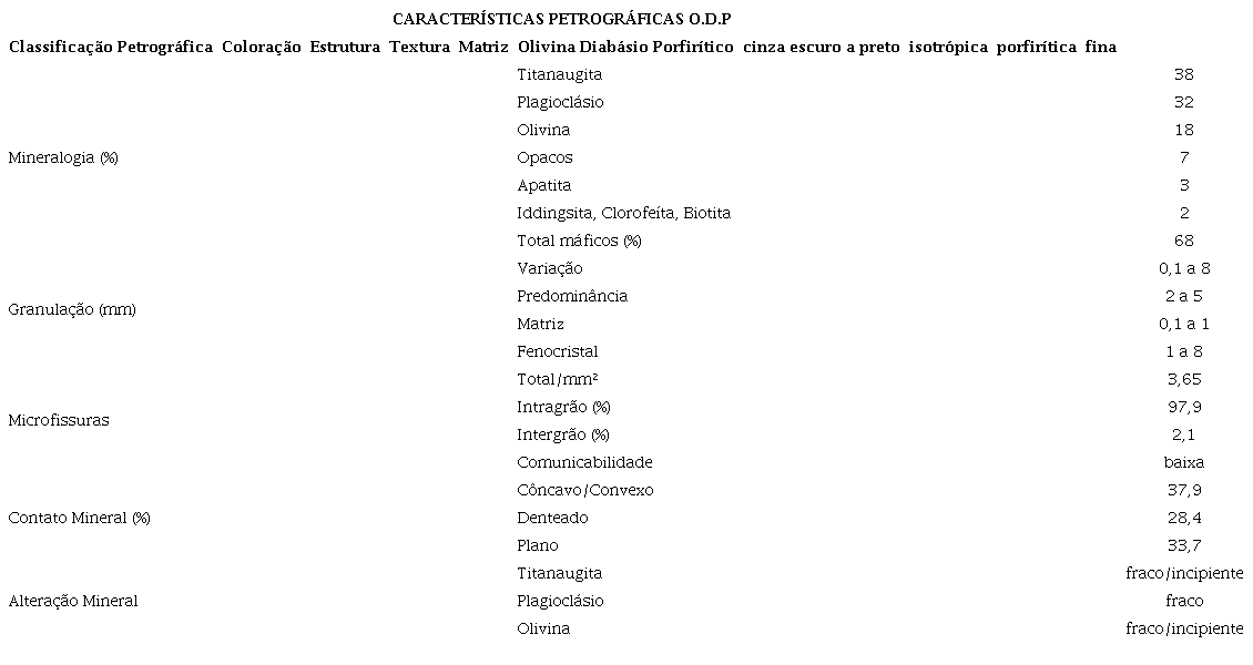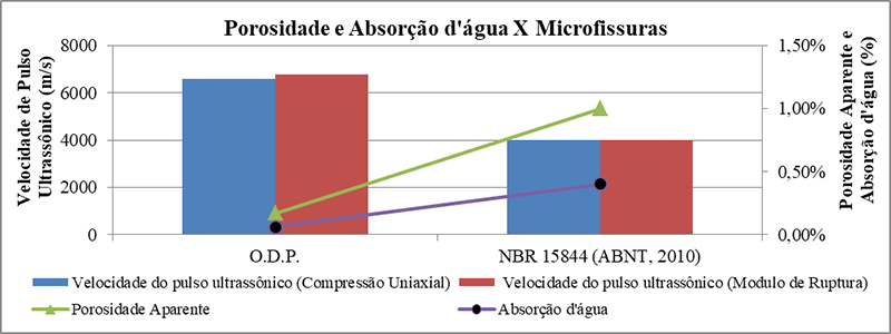 Os valores do Olivina Diabásio Porfirítico registam elevados índices de velocidade de propagação das ondas ultrassônicas, refletindo a sua maior densidade aparente e os seus baixos índices de porosidade aparente e absorção de água, a despeito do seu expressivo grau de microfissuramento intragrão.