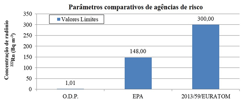 Os dados obtidos foram comparados aos limites aceitáveis de exposição do gás radônio em ambientes internos, indicados pelas agências de risco EPA (Environmental Protection Agency) nos Estados Unidos e EC (European Commission) na União Européia.