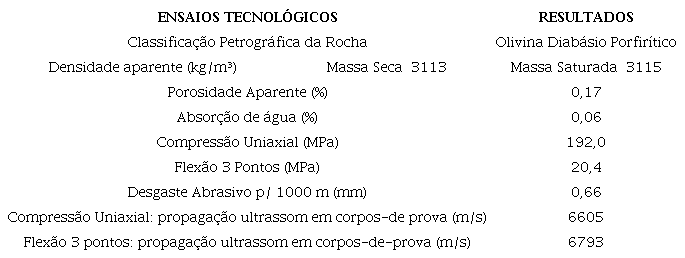 A rocha analisada apresenta densidade aparente seca de 3113 kg/m3, densidade aparente saturada de 3115 kg/m3, porosidade aparente de 0,17% e absorção de água de 0,06%. Para o ensaio de resistência à compressão uniaxial o diabásio revelou o valor de 192,0 MPa e para a flexão por carregamento em 3 pontos uma tensão de resistência de 20,4 MPa. O diabásio apresentou desgaste abrasivo de 0,66 mm, ao final do percurso de 1000 m. Em relação ao ensaio de propagação de ondas ultrassônicas longitudinais, a rocha analisada possui valores médios de 6605 m/s para os corpos-de-prova da compressão uniaxial simples e 6793 m/s para os corpos-de-prova da flexão 3 pontos ( Tabela 2).