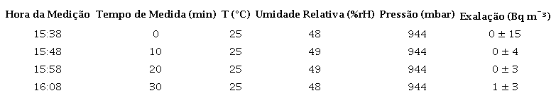 O resultado referente a exalação de radônio (1,01 Bq m-3) mostrou valor muito abaixo dos limites sugeridos pela Environmental Protection Agency (EPA) de 148 Bq m-3 e da European Commission (EC) com valor de 300 Bq m-3 ( Figura 9).