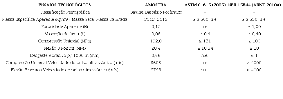 Em consequência de todos os resultados obtidos em ensaios tecnológicos físico-mecânicos, os parâmetros analisados satisfazerem os valores recomendados pelas normas NBR 15844 (ABNT 2010a) e pela C-615 (ASTM 2005), o Olivina Diabásio Porfirítico cumpre os requisitos necessários para a exploração, comercialização e aplicação como rocha ornamental.