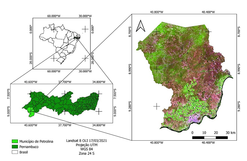 A área de estudo correspondeu ao município de Petrolina, localizado no estado de Pernambuco, o qual possui uma área de 4.561,590 km². Em extensão territorial, Petrolina se destaca como um dos maiores municípios do estado de Pernambuco. Situa-se a 09° 23’ 03” de latitude Sul e 40° 30’ 22” de longitude Oeste (Figura1). E têm suas atividades econômicas especialmente relacionadas à agricultura graças à disponibilidade hídrica do Rio São Francisco.