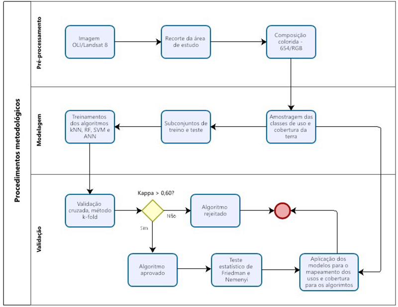 A Figura 2 demonstra o fluxograma para o processamento da imagem, bem como o treinamento dos algoritmos de aprendizado de máquina englobados nesse estudo. Como produto, apresenta-se o mapeamento do uso e cobertura da terra para ambos os algoritmos em estudo.